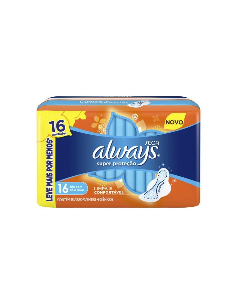 HIGIENE PESSOAL>ABSORVENTE>ABSORVENTE COM P&G ABAS SECA SUPER PROTEÇÃO ALWAYS PACOTE 16 UNIDADES LEVE MAIS PAGUE MENOS